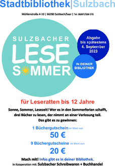 Sulzbach. Zum Start in die Sommerferien lädt die Stadtbibliothek wieder zum Lesesommer ein. Bereits zum sechsten Mal findet diese Leseförderaktion in Sulzbach statt. Jahr für Jahr beteiligen sich rund 100 Kinder daran. Unterstützt wird die Aktion auch in diesem Jahr wieder vom Ministerium für Bildung und Kultur sowie der Sulzbacher Buchhandlung Reiber. Wer vom 22. Juli bis zum 03. September drei Bücher gelesen hat nimmt an einer Verlosung statt. Zuvor müssen die gelesenen Bücher auf entsprechenden Teilnahmeblättern kurz bewertet werden. Wer möchte, kann sich die passende Lektüre gerne in der Bibliothek ausleihen. Dazu wurden viele neue Kinderbücher angeschafft. Vorgaben gibt es aber keine. An der Sommerleseaktion teilnehmen dürfen alle Kinder der Klassenstufe 1 bis 5. Die Erziehungsberechtigten müssen diese dazu anmelden. Anmeldeformulare und weitere Informationen dazu gibt es in der Stadtbibliothek. Und das sind die Preise: Hauptgewinn ist ein Büchergutschein im Wert von 50 Euro. Die Preise zwei bis zehn sind Büchergutscheine im Wert von je 20 Euro.