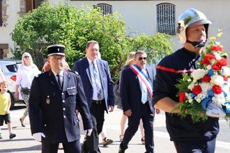 Gemeinsam marschierten die Delegationen aus Sulzbach und Rémelfing vom ehemaligen Schloss, dem heutigen Rathaus, zum „Monument aux morts“, dem Mahnmal für die Gefallenen im Ersten Weltkrieg. Der Fanfarenzug St. Pierre begleitete diesen Marsch musikalisch. Am Mahnmal gedachte man den Gefallenen und legte im Namen der beiden Kommunen jeweils einen Kranz nieder. Im Anschluss wurde in der Ortsmitte gemeinsam gefeiert.