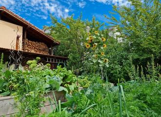 Gartenbeschreibung: die Insektenvielfalt ist sofort spürbar, blühende insektenfreundliche Pflanzen -auch blühende „Unkräuter“ füllen die Freiflächen zwischen Obstbäumen und einigen Hochbeeten, die entsprechend der Jahreszeiten bepflanzt sind. Dünger wird selbst hergestellt. Die Ernte aus den Hochbeeten reicht laut Walter Schwingel für das ganze Jahr. Die Familie Schwingel wurde nach und nach zu Selbstversorgern. Der eigene Kompost wird verwertet und das Regenwasser zur Bewässerung genutzt. Ein kleiner Teich lockt Insekten und Libellen an. An einer Trockenmauer aufgeschichtet aus alten Beton und Ziegelseinen tummeln sich Eidechsen. Auf dem Grundstück gibt es mehrere Sitzgelegenheiten, die immer wieder gerne zum Verweilen und Beobachten einladen.