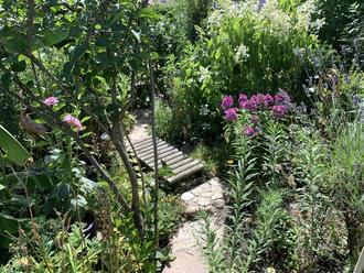 Gartenbeschreibung: Herr Dr. Thomas Groß überlässt seinen Garten größtenteils der Natur. Dies spiegelt sich in einem sehr belebten Garten wieder. Ein umgestürzter Baum, dient als Vogelhausaufhänger und das dortige Totholz bietet einen reichhaltigen Lebensraum für Insekten und Igel. Trotz der großen Naturverbundenheit setzt Dr. Thomas Groß auch Akzente, damit der Garten ihm selbst auch Freude bereitet. Sein Ziel ist es mit seinem Garten ein lebendiges Miniaturökosystem zu erschaffen und trotzdem selbst im Garten entspannen zu können. Um dieses Gleichgewicht herzustellen, sind im Garten mehrere Sitzgelegenheiten verteilt, um die Natur zu genießen.