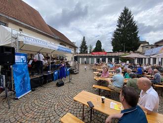 Gekühlte Getränke und schattige Plätzchen unter den Schirmen des angrenzenden Bistros sorgten bei den schwülen Temperaturen für eine willkommene Abkühlung. Der Applaus nach jedem Stück und die begeisterten Zurufe bestätigten, dass das Kulturamt mit seiner erneuten Einladung der Uni-Bigband Homburg einen Volltreffer gelandet hatte. „Ich finde das kulturelle Angebot der Stadt großartig“, sagte eine Besucherin aus Hühnerfeld. „Es ist abwechslungsreich und sehr unterhaltsam. Ich bin dankbar, dass so etwas hier geboten wird.“