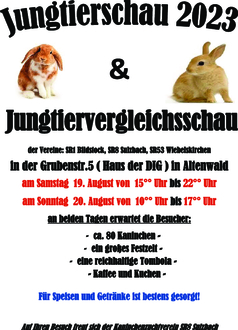 Am Samstag und Sonntag, 19. August + 20. August 2023 laden die Kaninchenzüchter vom SR8 Sulzbach zu ihrer Jungtierschau und der Jungtiervergleichsschau mit den Vereinen SR1 Bildstock und SR 53 Wiebelskirchen ins Stadtteilzentrum Grubenstr. 5 in Altenwald ein.