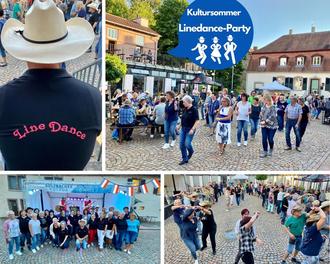 Die zahlreichen Tänzerinnen und Tänzer bewegen sich beim Linedance nicht paarweise sondern einzeln synchron in Reih und Glied zu einer jeweils festgelegten Choreografie. Jedes Lied, das meist aus den Bereichen Country und Pop stammt, hat einen eigenen Tanz. Die Schrittfolgen, die sich beispielsweise „Southside Shuffle“, „Irish Stew“ oder Cowboy Charlston“ nennen, sind überall gleich. So können alle Tänzerinnen und Tänzer in Reihen und Linien vor- und nebeneinander die gleichen Schritte tanzen. Die Tänze sind passend zur Musik choreografiert. Menschen auf der ganzen Welt begeistern sich dafür. „Das ist wie gemeinsames Singen. Wenn man ein Lied kennt, kann man es alleine, zu zweit oder im Chor gemeinsam singen. Es verbindet ohne Worte! Genauso ist es mit den Tänzen beim Linedance“ vergleicht es Kulturamts-Mitarbeiterin Stefanie Bungart Wickert, die das Kultursommerprogramm organisiert hat. Bereits zur Premiere im letzten Jahr waren schon etwa hundert Lindedance-Freundinnen und Freunde angereist. In diesem Jahr waren es deutlich mehr. Offensichtlich hat es sich in den Kreisen herumgesprochen, dass es in unserer Stadt schön ist. Auch die Linedancegruppe des Sulzbacher Kneippvereins und Tanzfreunde aus unserer Partnergemeinde Rémelfing waren zu Gast. Die Wiege des Linedance liegt in den Vereinigten Staaten. Von hier aus breitete er sich in der ganzen Welt aus. Auch hierzulande wird der Gruppentanz immer beliebter. Getanzt wurde fast vier Stunden lang. Doch zwischendurch gab es auch Gelegenheit für ein Erinnerungsfoto der Sulzbacher und Rémelfinger Tänzerinnen und Tänzer vor der Bühne.