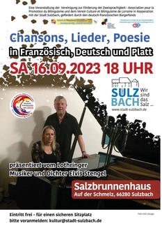 Elvis Stengel ist trotz seines amerikanischen Vornamens ein durch und durch lothringischer Künstler und als solcher ein "Kind seiner Heimat". Dies belegen die vielen Auftritte auf lothringischen und elsässischen Bühnen. Der Poet, Liedermacher und Sänger (im Zivilberuf Biobauer) präsentiert eigene Lieder in Lothringer Platt, in französischer Sprache und auf Deutsch sowie Chansons anderer Liedermacher (Reinhard Mey, Hannes Wader, Bettina Wegner, Jacques Brel und Renaud). In Sulzbach wird er wie schon bei vielen anderen Aufritten von seiner Tochter Céline am Klavier begleitet.