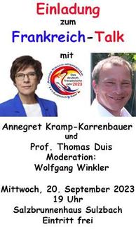 Im Rahmen des Sulzbacher Elysée-Jahres lädt das Sulzbacher Elysseé-Organisationskomitee diese beiden Experten zu einer unterhaltsamen Talkrunde mit dem Schwerpunktthema „Frankreich“ ein. Am Mittwoch, 20. September 2023 wird sich ab 19 Uhr im Salzbrunnenhaus Liedermacher und Chansonnier Wolfgang Winkler, ehrenamtlicher Beauftragter der Stadt für den deutsch-französischen Austausch, mit den beiden Gästen unter anderem über Themen zu Kultur, Geschichte, Sprache, Politik und mehr mit Bezug zu unserem Nachbarland austauschen.