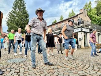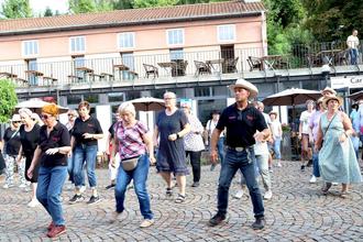 Die Hüfte drehen, einen Schritt nach links und dann nach rechts – den Zwischenschritt nicht vergessen. Nun das Gewicht auf den anderen Fuß verlegen. Das alles ist kein Hexenwerk. Wie locker Line-Dance die Hüften macht, davon überzeugten sich am Samstag, 24. August 2024, zahlreiche Besucher im Innenhof des Salzbrunnen-Ensembles. Dort fand die große Line-Dance-Party innerhalb des Kultursommers der Stadt statt.