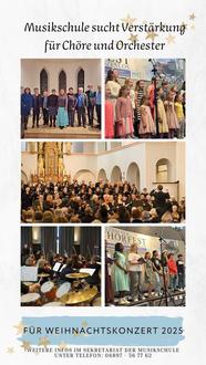 Auch das Orchester würde sich über zusätzliche Mitspieler – insbesondere Geigen und Bratschen sowie tiefe Blechbläser (z.B. Posaune, Horn) - freuen. Aber selbstverständlich auch alle anderen Instrumentalisten im Musikschul-Orchester herzlich willkommen.