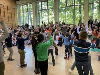 Freitags war dann endlich die große Aufführung. In einer von den Eltern und Verwandten sehr gut besuchten Turnhalle wurden alle Tänze präsentiert. In einigen Klassen staunten die Zuschauer nicht schlecht über "Tricks" und Brakedance-Elemente. Wir bedanken uns ganz herzlich für die gute Bewirtung durch den Förderverein der Waldschule.
