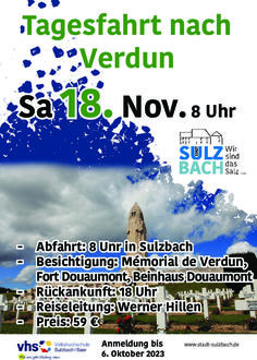 Sie fahren im Reisebus in Sulzbach um 8 Uhr morgens ab und besichtigen vor Ort das Mémorial de Verdun, das Fort Douaumont und das Beinhaus von Douaumont. Die Eintrittspreise sind in der Fahrt bereits enthalten. Gegen 18 Uhr wird der Bus wieder in Sulzbach ankommen.