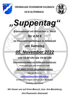 Am Samstag, den 05. November 2022 veranstaltet die Freiwillige Feuerwehr Altenwald in der Zeit zwischen 12.00 Uhr und 14.00 Uhr ihren Suppentag, mit anschließendem Kaffee und Kuchen. Die Suppe ist bis 13.30 Uhr erhältlich, jedoch nur solange der Vorrat reicht.