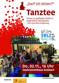 Am Donnerstag, den 2. November um 16 Uhr heißt es im Sulzbacher Salzbrunnenhaus wieder: „Darf ich bitten?“. Dann hat das inzwischen gut eingespielte „TanzTeeTeam“ wieder alles für Tanzfreudige „Ü 50“ vorbereitet. Um die niveauvolle Musikauswahl (von gepflegter Orchestermusik bis zu ohrgängigen Schlagern und auf Wunsch auch eigene Lieblingstitel) kümmert sich Jürgen Knieling, die kompetente Tanzanimation übernimmt Alexander Becker und motiviert dabei sowohl zu klassischen Standard- bzw. lateinamerikanischen Tänzen als auch zu kleinen Gruppenchoreographien. Stefanie Bungart-Wickert von der Stadtverwaltung ist für Ambiente und Organisation zuständig und um das leibliche Wohl kümmert sich das Bistro „Carrée“ Bei dem inzwischen sehr beliebten Angebot für die reifere Generation hat sich unter den Stammgästen eine beinahe familiäre Atmosphäre eingestellt, in der sich alle ungezwungen auf der Tanzfläche bewegen können - mal angeleitet, mal völlig frei, ob als Paar oder alleine. Aber, auch, wer nur wegen der Geselligkeit kommt, ist herzlich willkommen! Es ist immer Gelegenheit für eine nette Unterhaltung…