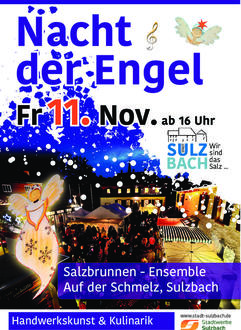 Historisches Ambiente, festlich dekoriert, Einstimmung in die besinnliche Jahreszeit - diese Faktoren bestimmen die traditionelle, voradventliche Veranstaltung im Innenhof des Salzbrunnenensembles in Sulzbach auch wieder in diesem Jahr. Die „Nacht der Engel“ zeigt mit einer großen Anzahl an Kunsthandwerkern und Hobbyisten Handwerk und eine große Palette verschiedener Produkte. Sulzbacher Vereine, beispielsweise die „KIS“ oder die „KaJuKa“ sind wieder mit dabei. Für die kulinarischen Genüsse wird ebenfalls gesorgt sein. Es gibt eine reiche Auswahl an Speisen und Getränken passend zur Adventszeit.