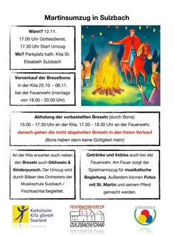Bons für die Martinsbrezeln können vom 25.10. - 08.11. an der Kita oder montags (30.10. und 06.11.) zwischen 18 - 20 Uhr bei der Feuerwehr Sulzbach erworben werden.