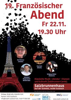 Die Stadt Sulzbach lädt ein zum französischen Abend. Dieser findet statt am Freitag, 22. November 2024, 19.30 Uhr im Salzbrunnenhaus. Der Einlass beginnt um 18.30 Uhr. Das bunt gemischte Programm besteht aus einer Lesung von Rolf Klöckner, einem klassischen Konzert von Paul Gurti sowie Chansons von und mit Wolfgang Winkler. Der Eintritt beträgt 10 Euro, Karten gibt es bei der VHS oder beim Kulturamt der Stadt, per Mail an vhs@stadt-sulzbach.de, unter Telefon 06897 508 500 sowie an der Abendkasse. Schirmherr des französischen Abends ist Bürgermeister Michael Adam.