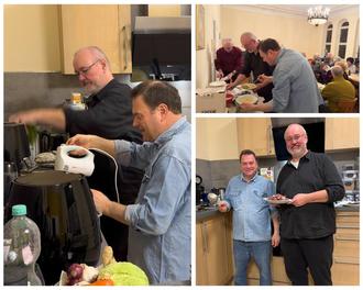 Auf dem Neuweiler Erntedankfest hatten Pfarrer Peter Sens und Bürgermeister Michael Adam nach einem vorangegangenen humorvollen Schlagabtausch den anwesenden Gästen spontan versprochen, gemeinsam demnächst für alle eine deftige Kartoffelsuppe kochen zu wollen. Die Zutaten zur Suppe wollte der Bürgermeister beisteuern, der Pfarrer sollte mit ihm gemeinsam kochen. Es sollte ein besonderes Abendmahl werden. „Ist gebongt“ hatte der Pfarrer damals mit erhobenem Daumen zugesagt. Sehr zur Freude der der Festbesucher. Am Sonntag, dem 3. November war es dann so weit. Rund zwanzig Gäste fanden sich im Kapitelsaal des katholischen Pfarrheims in Sulzbach ein und warteten gespannt, was die beiden Würdenträger in ihrer Küche aus Kartoffeln, Suppengemüse, Gewürzen und Kräutern zauberten.