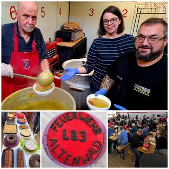 Großer Andrang herrschte beim Suppentag in Altenwald. Rund 330 Portionen Erbseneintopf wurden verzehrt, bereits vor dem Veranstaltungstermin waren keine Bons mehr verfügbar. Das zeigt den hohen Stellenwert dieser traditionellen Veranstaltung beim Feuerwehrverein Altenwald-Hühnerfeld. Auch viele Kuchenspenden sorgten erneut für einen willkommenen Nachtisch. An dieser Stelle danken wir den Spenderinnen und Spendern für ihre Unterstützung.