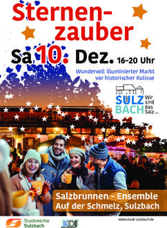 Der diesjährige „Sternenzauber“ findet wieder am Salzbrunnenhaus von 16 bis 20 Uhr statt. Dekorative Stände, zumeist von Vereinen gestaltet und betrieben, rahmen das historische Ambiente des Salzbrunnen-Ensembles ein. Die teilnehmenden Vereine haben sich ein reichhaltiges Angebot an vorweihnachtlichen Speisen und Getränken einfallen lassen. So wird der Förderverein des Kindergartens „Buntes Leben“ aus Hühnerfeld wieder seine beliebten Tornado-Spieße anbieten. Die Eröffnung durch Bürgermeister Michael Adam findet um 16.30 Uhr statt. Im Anschluss stehen auf dem Programm: der Schulchor der Gemeinschaftsschule Vopeliuspark "A Bag of Voices" und ab 19.30 Uhr der Shantychor „Saarshipper“ aus Fischbach. Zudem wird der Lichtkünstler Ingo Wendt mit seinen Leuchtblumen die weihnachtliche Stimmung unterstützen. Auch das Jugendzentrum Sulzbach ist in den Vorbereitungen für die diesjährige Weihnachtsbühne und wird sich am Weihnachtsmarkt Sternenzauber beteiligen. Herzliche Einladung an die Bevölkerung!