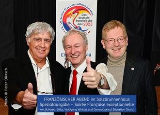 Auch die achtzehnte Ausgabe der „Soirée Française“ – des französischen Abends - lockte im Sulzbacher Élysée-Jahr am 25. November viele Zuschauer ins ausverkaufte Salzbrunnenhaus und sie wurden nicht enttäuscht, wie die gute Stimmung und der anhaltende Beifall bewies. Dieses Jahr wurde sogar eine „Spezialausgabe“ angekündigt. Anders als sonst bei dieser Traditionsveranstaltung gestaltete der Initiator und Chansonier Wolfgang Winkler den Abend gemeinsam mit Schorsch Seitz unter dem Motto „Ein musikalischer Frankreich-Talk mit Chansons und klooren Sprüchen“. Seitz hatte bewusst an diesem Abend auf seine Markenzeichen - die übliche rote Jacke und den Hut – verzichtet, um den besonderen Charakter dieses gemeinsamen Auftritts zu demonstrieren.