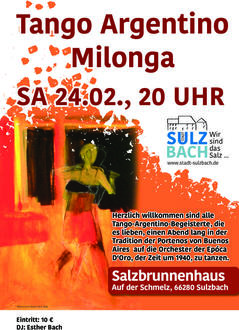 Am Samstag, 24. Februar lädt das Kulturamt der Stadt Sulzbach zum zweiten Mal zur Milonga im Salzbrunnenhaus ein. Die Tanzveranstaltung beginnt um 20 Uhr und endet um 24 Uhr. Herzlich willkommen sind alle Tango-Argentino-Begeisterte, die es lieben, einen Abend lang in der Tradition der Portenos von Buenos Aires auf die Orchester der Epóca D'Oro zu tanzen, der Zeit um 1940. Den Service an der Bar übernimmt das Bistro Carrée, Esther Bach ist verantwortlich für die Musikauswahl. Kostenlose Parkplätze gibt es reichlich direkt vor dem Ensemble und auch an der nahen Aula.