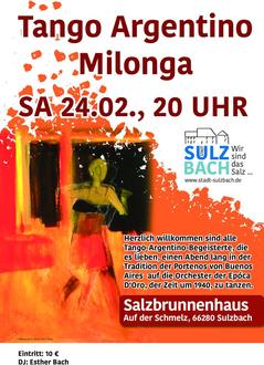 Am Samstag, 24. Februar lädt das Kulturamt der Stadt Sulzbach zum zweiten Mal zur Milonga im Salzbrunnenhaus ein. Die Tanzveranstaltung beginnt um 20 Uhr und endet um 24 Uhr. Herzlich willkommen sind alle Tango-Argentino-Begeisterte, die es lieben, einen Abend lang in der Tradition der Portenos von Buenos Aires auf die Orchester der Epóca D'Oro zu tanzen, der Zeit um 1940. Den Service an der Bar übernimmt das Bistro Carrée, Esther Bach ist verantwortlich für die Musikauswahl. Kostenlose Parkplätze gibt es reichlich direkt vor dem Ensemble und auch an der nahen Aula.