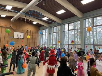 Nach der Pause gab es dann kein HALTEN mehr. Die Narren stärkten sich noch schnell mit leckeren frisch gebackenen Berlinern. An dieser Stelle ein ganz herzliches DANKE an den Förderverein, der die Berliner zur Verfügung gestellt hat. Danach erstürmten sie mit lauten „Alleh Hopp“-Rufen in einer Polonaise die schön geschmückte und auch neu gestrichene Turnhalle. Mit Ballons, Tänzen und lauten Faschingsliedern wurde bis Schulende gefeiert.