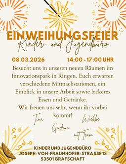 RINGEN. Auch wenn der Umzug in die neuen Räumlichkeiten in der Joseph-von-Fraunhoferstr. 13 nun schon etwas länger zurückliegt, wollen es sich die Jugendpflegerinnen der Gemeinde Grafschaft in neuer Teamkonstellation nicht nehmen lassen gemeinsam, mit vielen Interessierten, die Einweihung zu feiern.