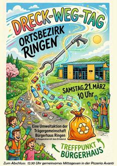 RINGEN. Wenn der Frühling beginnt, wird im Ortsbezirk Ringen wieder gemeinsam angepackt: Die Trägergemeinschaft Bürgerhaus Ringen lädt in Kooperation mit dem Ortsbeirat Ringen zum Dreck-Weg-Tag ein. Die Umweltaktion findet am Samstag, 21. März, statt. Treffpunkt für alle Helferinnen und Helfer ist um 10 Uhr am Bürgerhaus Ringen.