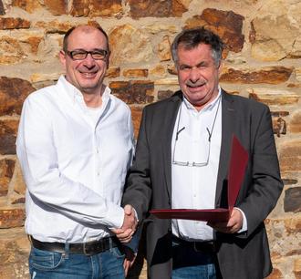 FRIEDSAM. Werbeagentur - JHV Vorsitzender Friedhelm Münch (re.) wünscht dem neuen Geschäftsführer Stephan Schmidt (li.) gutes Gelingen für die anstehenden Aufgaben.