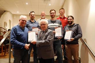 Vorsitzender Dieter Sebastian (vorne) zeichnet (v.l.) Egon Knieps, Dominik Knieps, Dieter Bornschlegl, Johannes Kappen und Sven Wollert aus. Auch Geschäftsführer Andreas Bauer (2.v.r.) gratuliert.