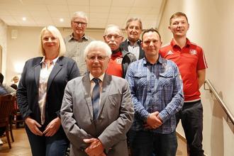 Der Vorstand des VfB Lantershofen mit (v.l.) Kathleen Mühle, Alla Krämer, Dieter Sebastian, Heinz-Albert Bender, Wilfried Ley, Maik Dünker und Andreas Bauer. Es fehlen Jörg Bender, Andreas Groß, Ricardo Otto, Gerd Powelz, Thorsten Oster und Burkhardt Steding.