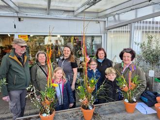 Stolz präsentieren Groß und Klein die wunderschönen Blumenampeln
