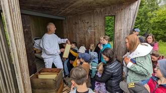 Hierzu sind traditionell ausdrücklich nicht nur Vereinsmitglieder eingeladen, sondern alle Bürger des Dorfes. Ziel ist es seit jeher, die Dorfgemeinschaft zu stärken und beim Wandern sowie im anschließenden geselligen Teil miteinander ins Gespräch zu kommen. Dies ist auch am Sonntag den 4. Mai abermals gelungen. Trotz anfangs wenig sonnenreich gemeldetem Wetter, versammelten sich über 100 Lantershofener am frühen Nachmittag an der Mehrzweckhalle, um nach einem kurzen Umtrunk gemeinsam in die Lantershofener Flur aufzubrechen. Die Wandergruppe zog dabei zum heimischen Sportplatz, ging von dort mit bestem Blick auf das Ahrtal weiter an Weinbergen und Feldern entlang bis auf den heimischen Birnenrundwanderweg, um schließlich als Zwischenstation an der „spirituellen Tankstelle“ Halt zu machen. Dort wartete neben dem kostenlosen Ausschank von Maibowle, Rotwein und Fruchtsäften für die Kleinsten, ein besonderes Highlight auf alle Interessierten: Der Lantershofener Imker Andreas Schneider, Mitglied des regionalen „Imkerverein Unterahr“, präsentierte zahlreiche anschauliche Imkerutensilien und einen praxisnahen Vortrag zur Biene, ihrem Lebensraum und ihren Eigenarten. Im Anschluss war es sogar allen Interessierten möglich, sich mittels Schutzanzug den nahen Bienenstöcken auf sonst ungewohnte Weise zu nähern und mit den nützlichen Insekten auf Tuchfühlung zu gehen. Im Anschluss zog die Wandergruppe wie gewohnt zur St. Lambertushütte als letzte Station der Wanderung. Dank guter Versorgung mit Speis und Trank, einer Hüpfburg und Kinderschminken für die Jüngsten und einer sich dann doch noch zeigenden Sonne, saß man schließlich noch bis in die frühen Abendstunden zusammen.