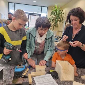 Jetzt war es endlich soweit, Kinder der Gemeinde waren eingeladen, zusammen mit Oma und/ oder Opa gemeinsam aktiv zu werden, und zwar im doppelten Sinne, für die Umwelt, vor allem aber auch für die generationsübergreifende Interaktion. Beim Bau von Nistkästen unter der fachlichen Anleitung von Tomy, dem Weltenbummler, kamen 19 Kinder zusammen mit ihren Begleitungen handwerklich zum Einsatz. Es wurde gemessen, gesägt und vor allem viel gehämmert. Man sah wie der ein oder andere das Hörgerät ein wenig leiser drehte. Dennoch störte niemand wirklich der Lärm, alle Anwesenden waren begeistert von der Idee und dem gemeinsamen Tun.