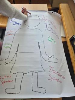 Nach der Pause wurde es anspruchsvoller. Wie bin ich? Welche Eigenschaften habe ich? Wenn ich gut reiten, Fußball spielen, klettern kann, welche Eigenschaften habe ich dann? Diese Fragen galt es zu beantworten und mit einer anderen Farbe in den „Körper“ zu schreiben.