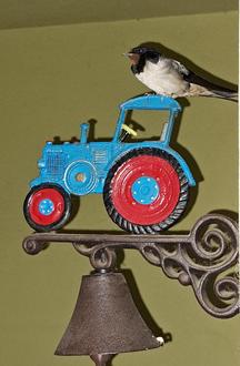 GRAFSCHAFT. Bei unserer Leserin und Zeitungsausträgerin Alexandra Reus aus der Grafschaft übernachtet regelmäßig eine Schwalbe auf der Türglocke. Da die Glocke mit einem Traktor verziert ist, ergibt sich ein lustiges Bild. Die Redaktion bedankt sich für den Schnappschuss vom kleinen Traktorfahrer und die amüsante Geschichte.