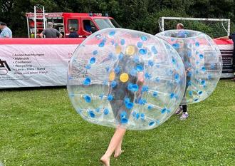 Ein Highlight war jedoch die Bubble Ball Fußball-Arena. In aufblasbaren Bällen konnte man vollständig eintauchen und Fußball in einer ganz neuen Erfahrung kennen lernen. Zwar wurde von den Kindern weniger ein Wettkampf durchgeführt, jedoch schnell erkannte man, dass sich diese Bälle gut zum Rollen oder Klettern eigneten. Der Spaß kam dabei von allein, sodass die Bälle ständig in Bewegung waren. Sogar mancher Erwachsener konnte sich dem Spektakel nicht entziehen und erprobte seine Möglichkeiten.