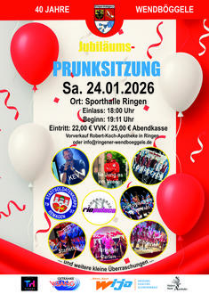RINGEN. Unter dem Sessionsmotto „40 Jahre Wendböggele“ wird am 24. Januar, ab 19.11 Uhr in der Sporthalle in Ringen mit Kinderprinzessin Pia I. und Adjutantin Helena mit Hofstaat die Jubiläums-Prunksitzung begangen.