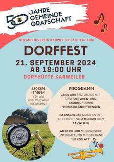 KARWEILER. Im Rahmen des 50-jährigen Bestehens der Gemeinde Grafschaft lädt der Musikverein Karweiler am Wochenende des 21. und 22. September zu einem stimmungsvollen Fest ein.