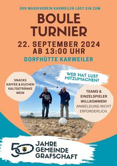 Das Boule-Turnier findet am Sonntag, 22. September, ab 13 Uhr auf dem Boule-Platz an der Karweiler Hütte statt. Alle Interessierten, ob Profis oder Anfänger oder Gruppen und Teams, sind herzlich eingeladen, teilzunehmen. Die Mannschaften werden vor Ort spontan gebildet, eine vorherige Anmeldung ist daher nicht erforderlich. Neben dem sportlichen Ehrgeiz stehen auch Kaffee und Kuchen sowie weitere französische und kulinarische Spezialitäten bereit. Ein motivierendes Publikum ist ebenso willkommen, um die Teilnehmer anzufeuern und gemeinsam das 50-jährige Bestehen der Gemeinde Grafschaft zu feiern.