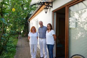 Schon zwei Jahre praktiziert Ulrich Hottenbacher in einer Gartenlaube an der Kölner Straße. Ihm zur Seite gehen Gabriele Seidel (l.) und Kerstin Lamberty.