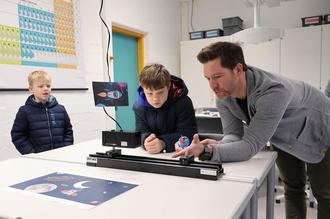 Physiklehrer Oliver Zorn (r.) nahm die Besucher mit auf eine spannende Reise durch das Weltall.
