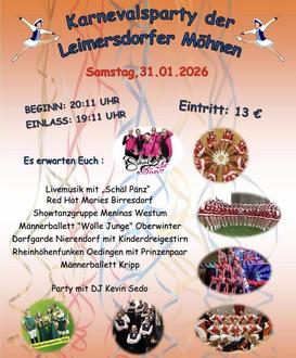 LEIMERSDORF. Am 31. Januar veranstaltet der Möhnenverein Leimersdorf seine Karnevalsparty im Haus des Dorfes. Beginn ist um 20.11 Uhr, Einlass ab 19.11 Uhr, Eintritt 13 Euro. Die Jecken erwartet ein tolles Programm mit Livemusik von den „Schäl Pänz“, die Red Hot Maries Birresdorf, die Showtanzgruppe Meninas Westum, das Männerballett „Wölle Junge“ Oberwinter, die Dorfgarde Nierendorf mit Kinderdreigestirn, die Rheinhöhenfunken Oedingen in Begleitung des Prinzenpaars sowie das Männerballett Kripp. Anschließend gibt es die Party mit DJ Kevin Sedo.