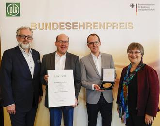 Verleihung des Bundesehrenpreises: Ministerialdirektorin Gaby Kirschbaum (rechts) überreicht gemeinsam mit DLG-Vizepräsident Dr. Diedrich Harms (links) Urkunde und Medaille an Peter-Josef Schütz und Johannes Schütz.