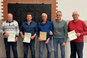 Für 25 JahreVereinsangehörigkeit wurden Stefan Demary und Günther Grodde mit dem bronzenen Vereinsabzeichen, für 40 Jahre wurde Frank Dräther mit dem silbernen Vereinsabzeichen, Franz Conrads und Heinz-Dieter Groß für 60 Jahre sowie für 70 Jahre Theo Leeser mit einem Präsent ausgezeichnet. Im Zuge dessen wurde Theo Leeser einstimmig von der Versammlung zum Ehrenmitglied ernannt.