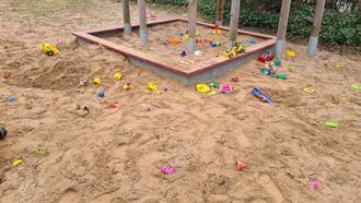 Auf dem Kleinspielbereich liegen viele Spielsachen, die Kinder gestiftet haben. Diese Spielsachen wurden fast alle zertreten und auf dem gesamten Spielplatz verstreut. Die Bilder sind erst nach einer Aufräumaktion von zwei Vätern gemacht worden.
