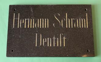 Die alten Wertinger erinnern sich vielleicht noch daran, dass es früher in der Pfarrgasse 7 eine Zahnarztpraxis gab. Ursprünglich betrieb der approbierte Bader und Dentist Paul Griesbauer (1874-1965) die Praxis. Als sich dessen Tochter Anni in den Schlosser Hermann Schraml (1909-1963) verliebte, stimmte der Vater einer Heirat nur unter der Bedingung zu, wenn der künftige Schwiegersohn die Praxis übernimmt. Daraufhin begann H. Schraml eine Ausbildung zum Dentisten einschließlich verschiedener Praktika in Augsburg. Nach bestandenen Prüfungen übernahm er die Praxis und heiratete 1936 Anni Griesbauer. Er wurde später jedoch eingezogen und war bis zum Kriegsende 1945 beim Militär. Erst danach konnte er seine Tätigkeit als Dentist wieder aufnahmen. Das Objekt des Monats Januar zeigt die Hinweistafel auf die Praxis in der Pfarrgasse 7. Die schwarze Steinplatte trägt die vergoldete Inschrift: Hermann Schraml, Dentist. Sie war bis Anfang der 1950er Jahre an der Fassade angebracht. 1952 änderte sich die Berufsbezeichnung. Aus „Dentist“ wurde „Zahnarzt“. Die Dentistenausbildung wurde 1952 in der Bundesrepublik Deutschland beendet. Von da an war für die Ausbildung ein Universitätsstudium Voraussetzung zur Ausübung des Berufes „Zahnarzt“.