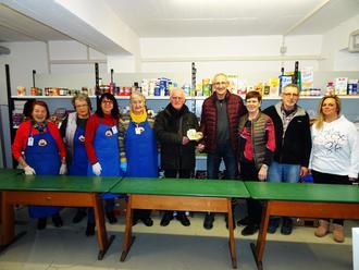 Sehr erfreut zeigte sich der Leiter der Wertinger Tafel, als ihm Peter Wiedenmann mit einer Spende von 600 Euro überraschte. Das Geld stammt aus der Christbaumsammelaktion der Wertinger Kolpingfamilie. Im Bild von links die Tafelhelferinnen und Helfer mit Barbara Krell, Elisabeth Mengele, Elfriede Weckmeister, Gerda Gumpp, Helmut Bauer, Peter Wiedenmann, Sofie Niesner,Michael Langmaier und Daniela Karg.