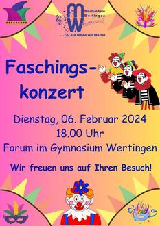 Am Dienstag, den 6. Februar um 18 Uhr veranstaltet die Musikschule ihr beliebtes Faschingskonzert im Forum des Gymnasiums Wertingen. Die Musikerinnen und Musiker der Musikschule freuen sich auf den Fasching und darauf, dass richtig gefeiert werden darf. Schon die Jüngsten stehen mit ihren Blockflöten bereit, um mit dem „Affentanz“, dem „Ameisenboogie“ und Cowboy Songs im großen Blockflötenorchester auftreten zu dürfen.