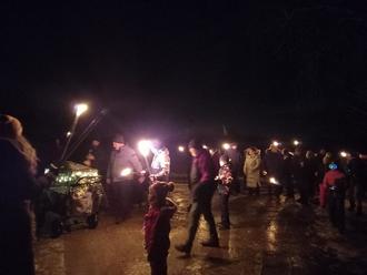 Trotz oder gerade wegen der winterlichen Temperaturen versammelten sich zahlreiche Teilnehmer pünktlich am Bürgerhaus, um gemeinsam in die Dunkelheit zu ziehen. Die Gruppe startete um 18:15 Uhr mit ihren leuchtenden Fackeln durch die Felder und den nahegelegenen Wald.