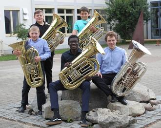 Die jungen Tubisten v. l. Lars Pfeiffer, Konstantin Denzel, Donatus Olowookere und Manuel Hitzler mit ihrem Lehrer Michael Rast laden zum Konzert ein.